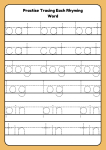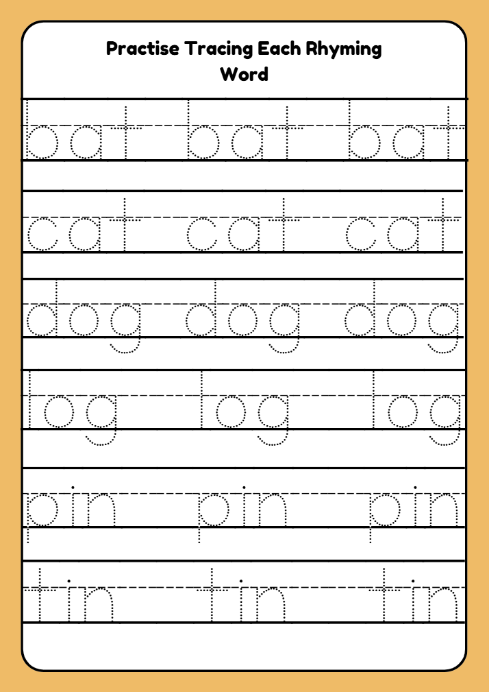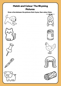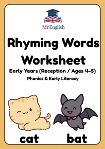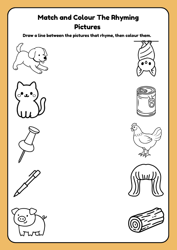 A fun and engaging rhyming words worksheet for Early Years Reception (ages 4–5). Supports phonics and early literacy through matching, colouring, tracing, writing, and drawing activities.