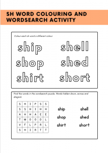 The booklet includes tracing tasks, a word colouring activity, and a themed word search — all designed to help learners recognise, read, and spell ‘ch’ and ‘sh’ words in an engaging way.