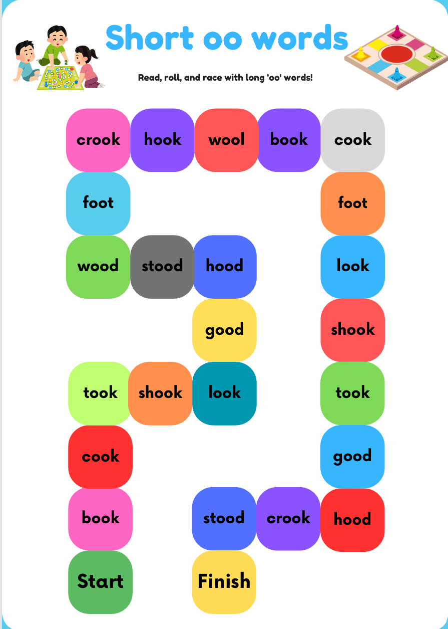 A fun and easy board game to help kids practise reading short “oo” words like book, foot, and good. Players roll the dice, read words, and race to the finish line! Perfect for phonics practice at home or in the classroom.