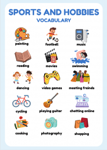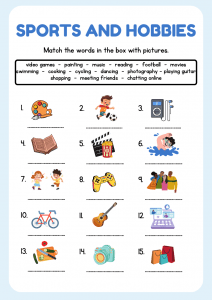 Make learning fun with this engaging Sports and Hobbies worksheet for kids! Perfect for young ESL learners, this activity helps children build vocabulary related to popular sports and leisure activities like football, swimming, dancing, and painting. Ideal for use in the classroom or during online English lessons.”