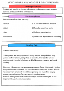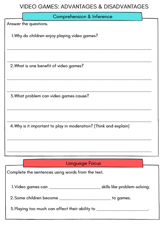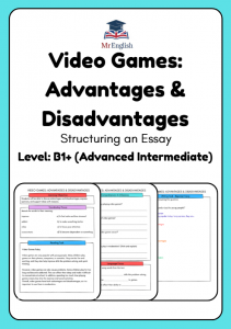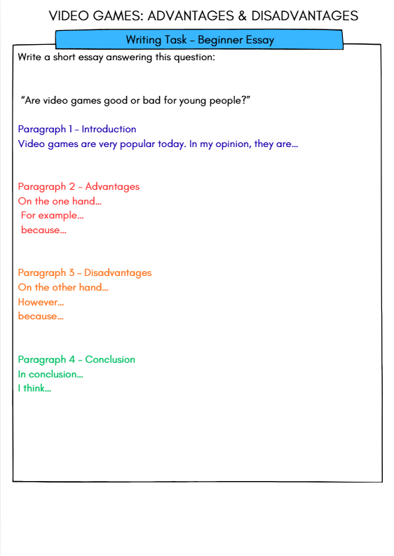 Help students learn how to structure an essay with this engaging B1 English worksheet for ages 10–12. Using the topic of video games, learners explore advantages and disadvantages through reading, vocabulary, comprehension, and a guided writing task. Perfect for ESL learners, Cambridge B1 preparation, and building confidence in essay writing.