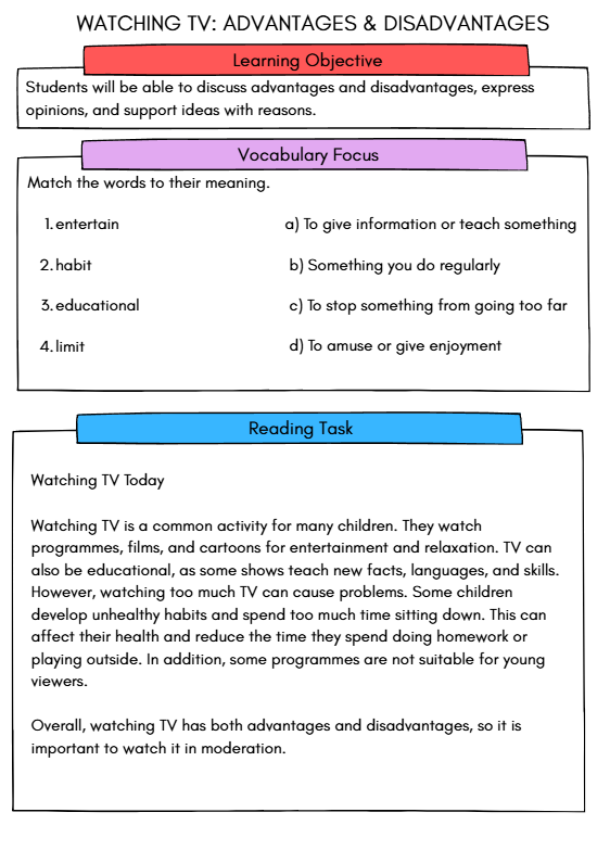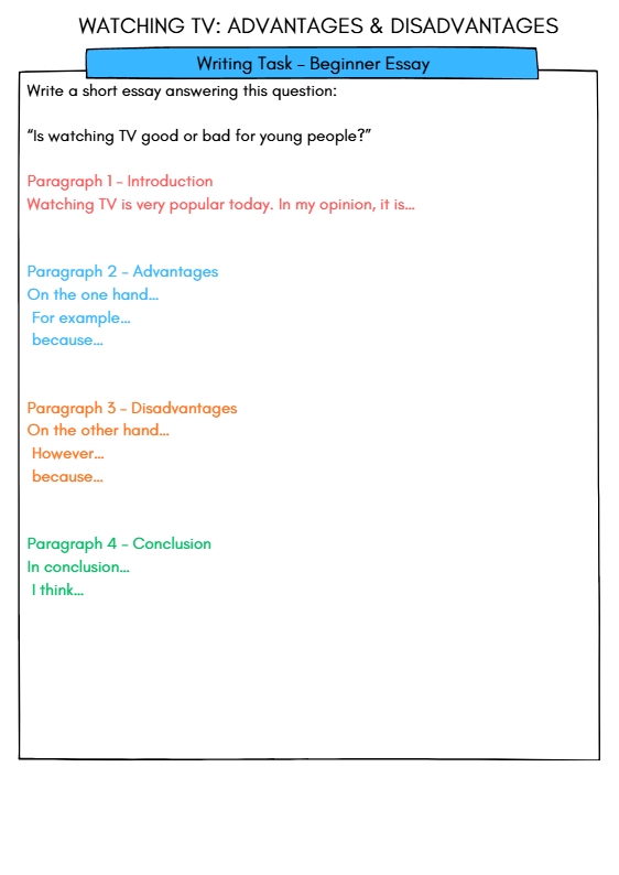 Teach students how to structure an essay with this engaging B1 English worksheet for ages 10–12. Using the topic of watching TV, learners explore advantages and disadvantages through reading, vocabulary, comprehension, and a guided writing task. Ideal for ESL learners, Cambridge B1 preparation, and improving essay writing skills.