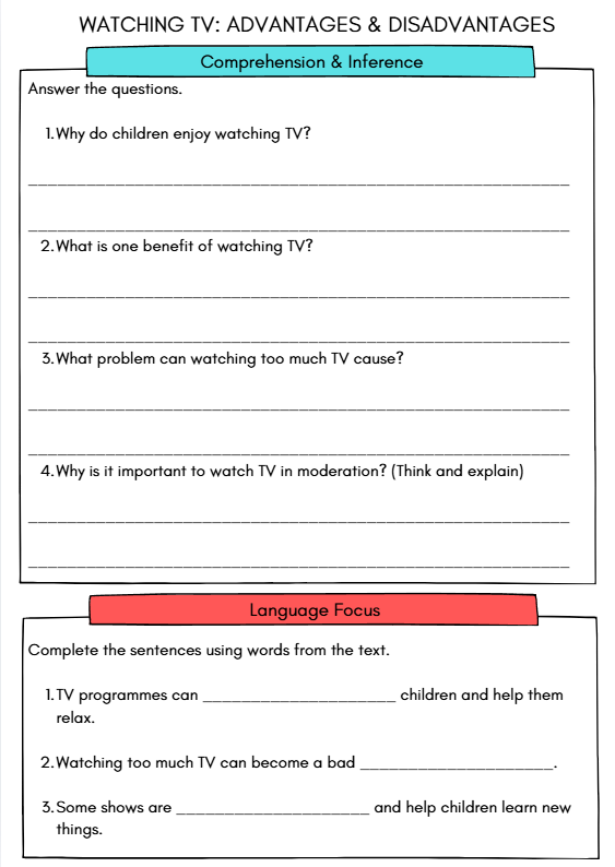 Structuring an essay teaches kids valuable skills that can enhance their learning experience. By understanding the advantages and disadvantages of essay writing, children can develop critical thinking and organization skills. Moreover, using an engaging activity like a worksheet about watching TV captures their interest, making the learning process enjoyable. Combining fun topics with educational content keeps kids motivated and eager to learn.