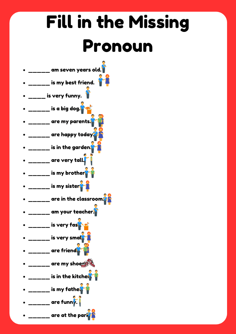 Engaging subject pronouns worksheet for children ages 6–10. Helps kids practice “I, you, he, she, it, we, they” with fun exercises and examples to build strong English grammar skills.