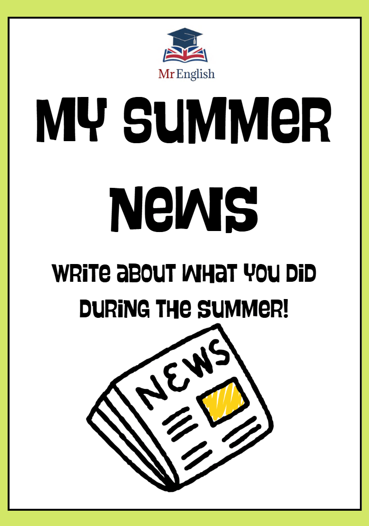 Fun back-to-school writing worksheet for children ages 6–11. Kids can write headlines, share summer holiday stories, and draw pictures of their adventures.