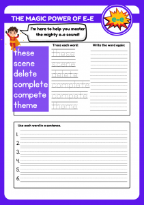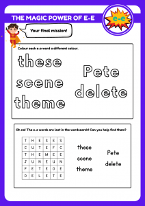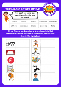 Join the superhero adventure with this engaging “Super E-e” worksheet! Perfect for kids aged 5-8, this fun activity helps young learners master the split digraph “e-e” through tracing, colouring, and sentence-building challenges.