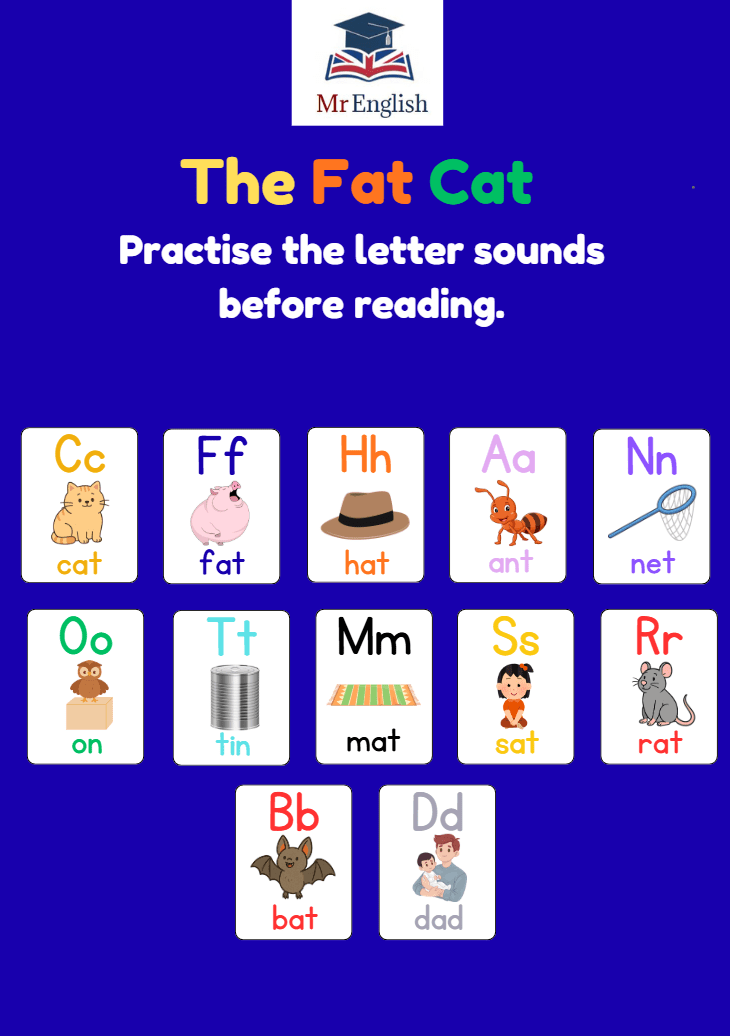 The Fat Cat phonics flipbook (ages 4–6) helps children learn CVC words in the -at family with simple, fun sentences. An ideal resource for preschool, kindergarten, and ESL learners. Available exclusively from Mr English.