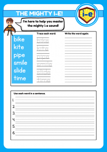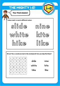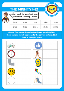 Unlock the superpower of the i-e sound with this free printable phonics worksheet! Packed with fun activities, word tracing, matching games, and a wordsearch to help kids learn long ‘i’ words like “bike,” “kite,” and “smile.”