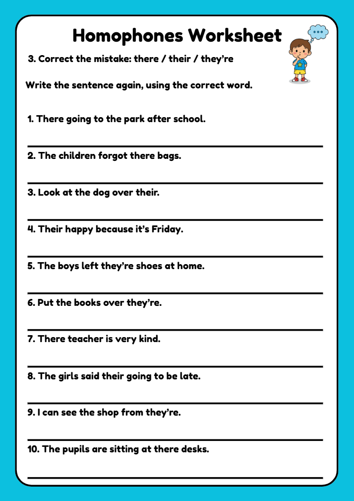 This there, their and they’re homophones worksheet is designed for children aged 7–9 (Year 3–Year 4). Pupils practise choosing the correct homophone, correcting mistakes, and writing their own sentences. Ideal for KS2, ESL learners, and children with dyslexia, this worksheet builds confidence with one of the most common grammar mistakes in English through clear explanations and structured practice.