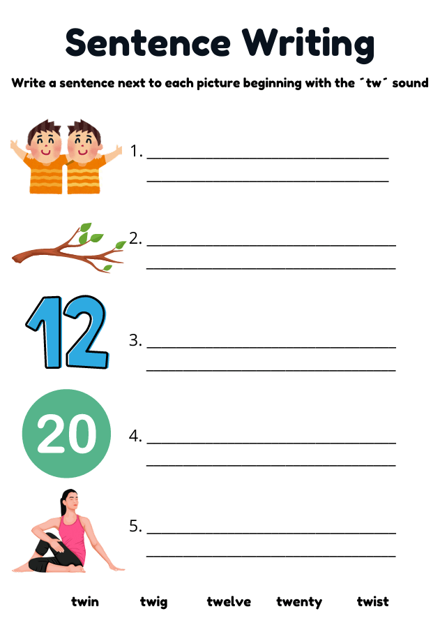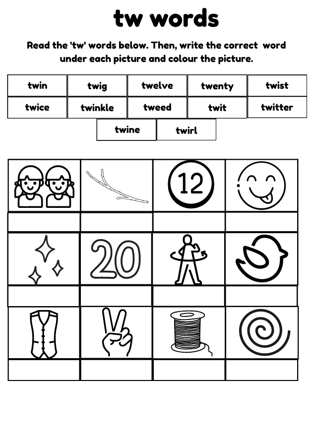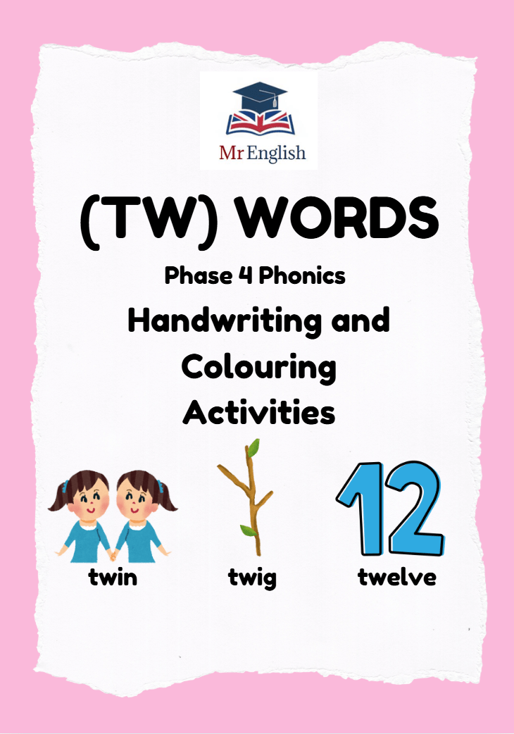 Exciting TW words worksheets for children ages 4–7 learning Phase 4 phonics. Includes handwriting, colouring, and sentence writing activities with words like twin, twig, twelve, twenty, twist, twirl, twinkle, and more.
