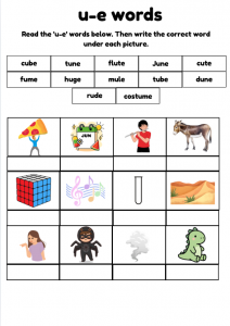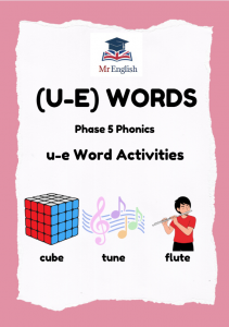 Fun Phase 5 phonics worksheets focusing on u-e (split digraph) words such as cube, tune, flute, June, and cute. Includes picture matching, sentence writing, clue-based activities, and a word search. Ideal for children aged 6–8, KS1, Year 1 & Year 2 learners, ESL students, and dyslexic-friendly phonics practice.
