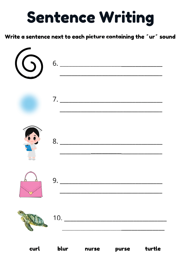 Fun and interactive phonics worksheet to help children learn ‘UR’ words such as fur, burn, nurse, and turtle. Includes handwriting, sentence writing, and colouring activities to boost early reading and spelling skills.