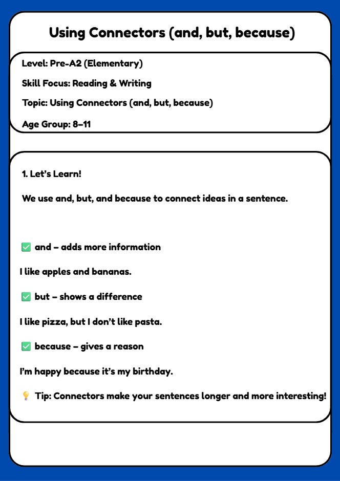 Learn how to join ideas with and, but and because! This fun Pre-A2 English grammar worksheet helps children aged 8–11 practise writing longer sentences and build confidence with connectors — perfect for Cambridge Starters & Movers learners.