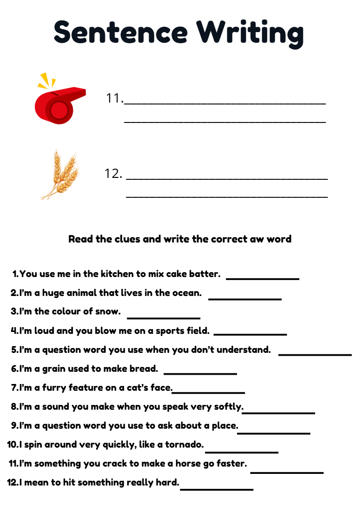 Engaging WH words worksheet for kids ages 6–8! Children solve 12 fun clues and fill in the blanks with words like whale, whisk, and whisper. Perfect for phonics practice, spelling, and early reading skills in the classroom or at home.