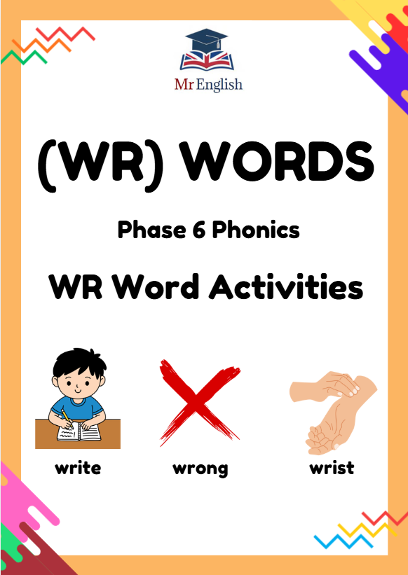 Engaging Phase 6 phonics worksheets focusing on silent WR words such as write, wrong, wrist and wrap. Includes spelling practice, sentence writing, word search and picture matching activities. Ideal for ages 7–9, KS1–KS2 transition, and SEND-friendly learning.