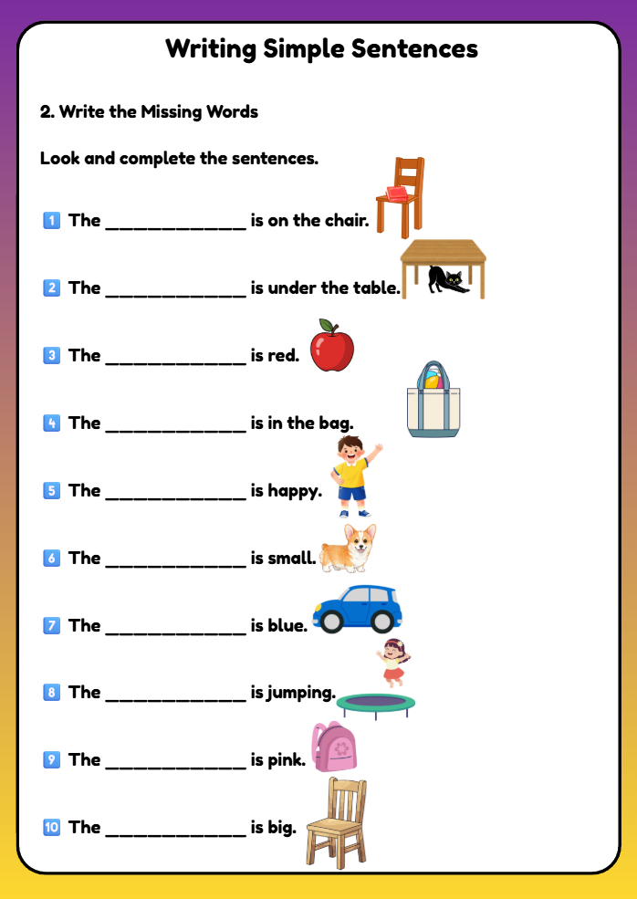 Help young learners practise sentence writing with this fun A1 worksheet. Students read, match, and create simple sentences using everyday words — perfect for Cambridge A1 Movers and ESL beginners aged 6–9.