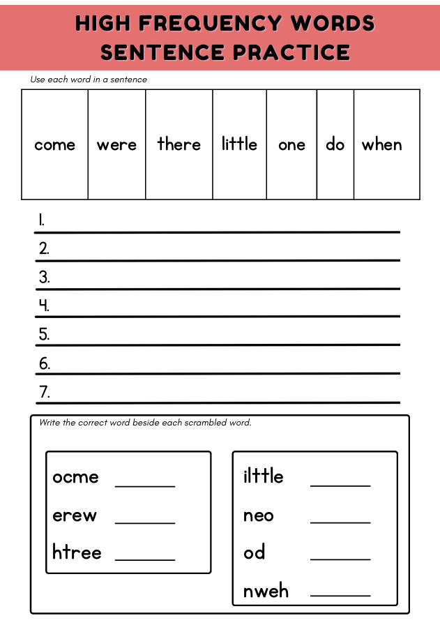 Support children aged 5–6 with this Year 1 spellings worksheet featuring common exception words: come, were, there, little, one, do, when. Perfect for classroom learning or home phonics revision.