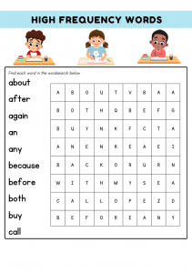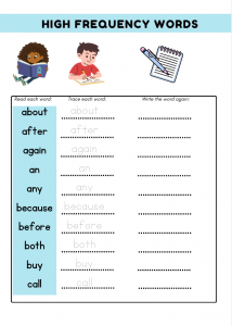 oost spelling skills with these Year 2 high frequency word worksheets for children aged 6–7. Includes fun activities such as tracing, writing, colouring, word searches, and scrambled words to practise spellings like about, after, again, any, because, before, buy, and call. Perfect for classroom or home learning.