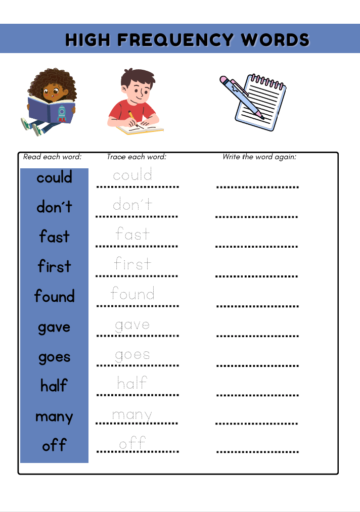 Engage children aged 6–7 with these Year 2 spelling worksheets focusing on high frequency words. Fun activities include tracing, writing, colouring, scrambled words, and word searches to practise spellings like could, don’t, fast, first, found, gave, goes, half, many, and off. Ideal for home or classroom learning