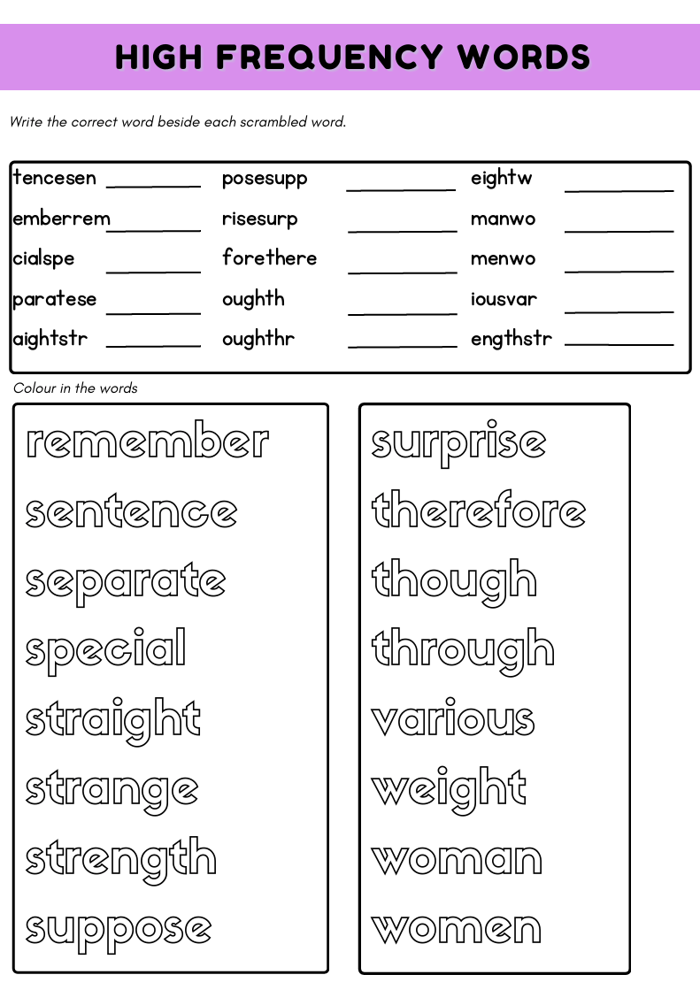 Year 3 spelling worksheet for ages 7–8. Includes high frequency words practice, sentence writing, scrambled words, colouring activity, and a fun wordsearch to build spelling confidence.