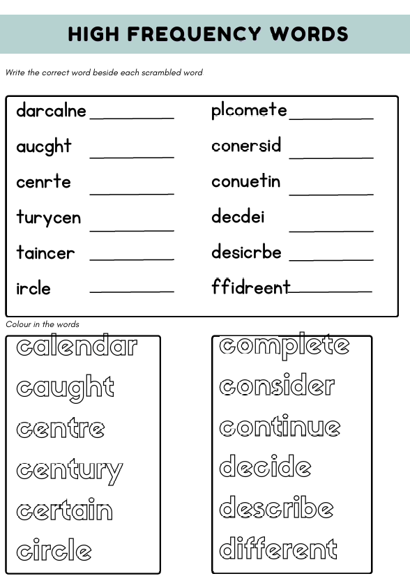 Support children aged 7–8 with this Year 3 high frequency words worksheet. Includes spelling practice, scrambled words, sentence writing, and a word search to build vocabulary and confidence.