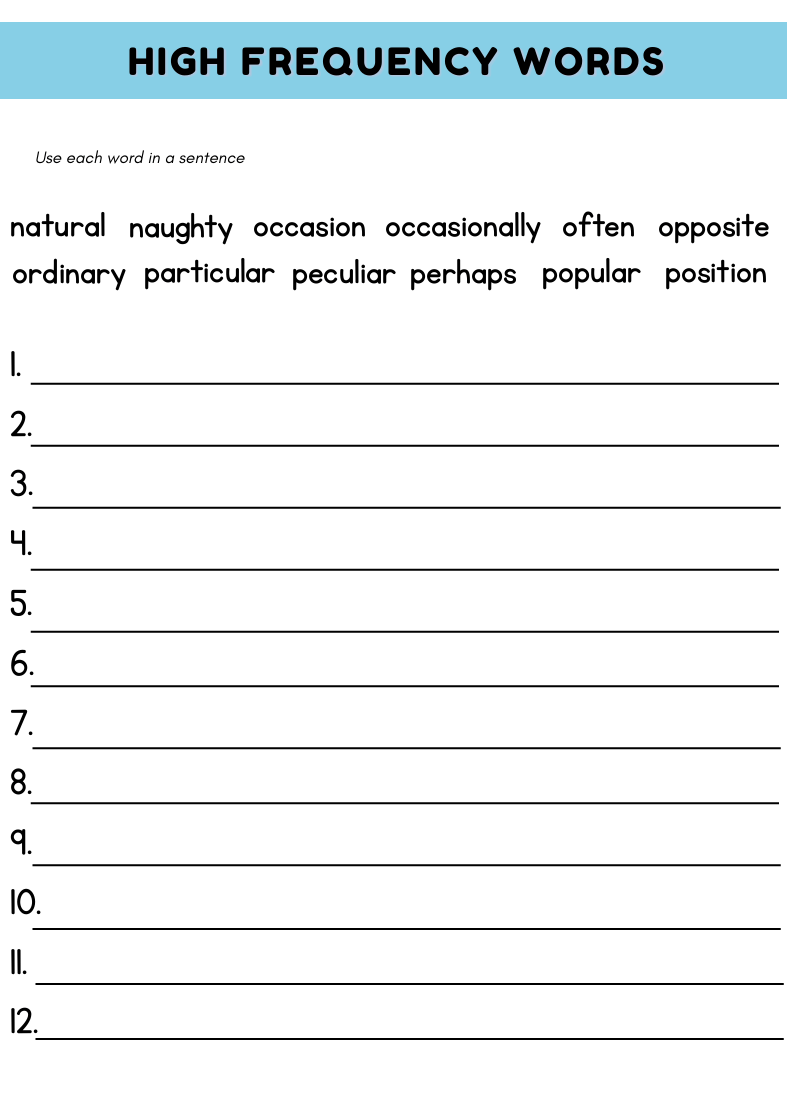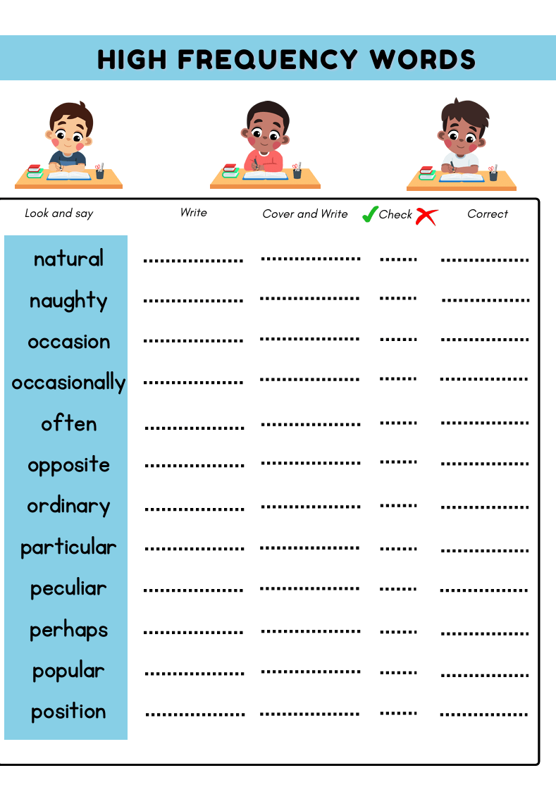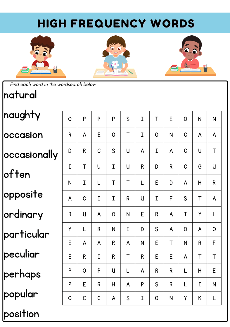 Support children aged 7–8 with this Year 3 high frequency words worksheet. Includes spelling practice, scrambled words, sentence writing, and a word search to help kids master tricky words like occasionally, opposite, and peculiar.