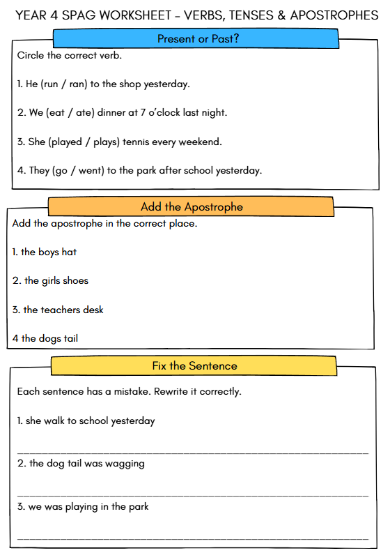 Year 4 SPaG Worksheet: Verbs, Tenses and Apostrophes is an engaging resource designed specifically for children aged 8–9. Kids will enjoy this interactive grammar activity as it combines fun learning techniques with essential language skills. By exploring verbs, tenses, and apostrophes, they can enhance their writing abilities in a creative way, making the learning process both entertaining and effective. With a focus on engaging exercises, this worksheet encourages kids to take pride in their language development as they tackle each challenge with enthusiasm.